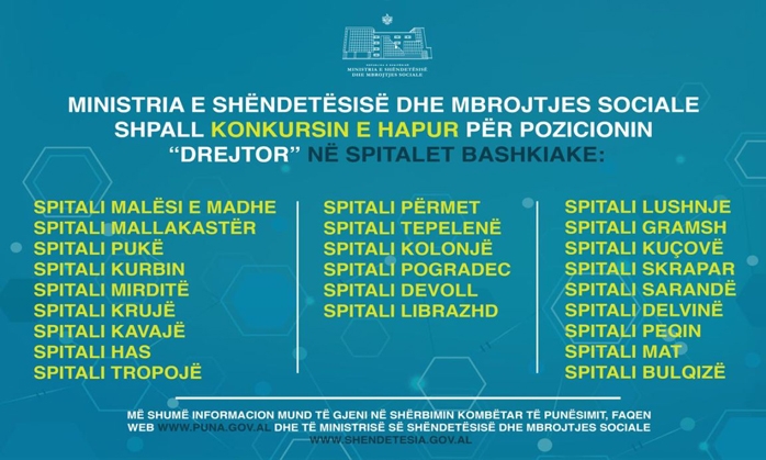 Ministria e Shëndetësisë dhe Mbrojtjes Sociale hap konkursin publik për drejtorët e spitaleve Bashkiake në të gjithë vendin. Kjo ministri fton të interesuarit të aplikojnë sipas procedurës së sqaruar në njoftimin publik të shpallur në faqe.