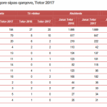 Sipas raportit të fundit të INSTAT, në muajin tetor numri i aksidenteve rrugore ka rënë me 4.7 %. Ndërsa edhe numri i të aksidentuarve ka shënuar ulje, krahasuar me vitin e shkuar. Qarku që ka më tepër aksidente vijon të jetë Tirana, ndjekur nga Durrësi dhe Lezha. Raporti thotë se në muajin Tetor 2017 numërohen 184 aksidente rrugore nga 193 aksidente të ndodhur në Tetor 2016. Në krahasim me Tetor 2016, numri i aksidenteve është ulur me 4,7 %. Numri i të aksidentuarve është 223 persona, nga 257 që ishte një vit më parë, për të njëjtën periudhë. Në dhjetëmujorin 2017, numri i të aksidentuarve është ulur 6,3 %, krahasuar me të njëjtën periudhë të një viti më parë. Numri i personave të plagosur gjatë muajit Tetor 2017 është 203, nga 230 persona të plagosur në Tetor 2016. Krahasuar me mesataren e personave të plagosur gjatë vitit 2016, ky numër është ulur me 2,9 %. Në Tetor 2017, aksidentet rrugore, në 82,6 % të rasteve, kanë ndodhur si pasojë e sjelljes së drejtuesit të mjetit. Në dhjetëmujorin 2017, aksidentet rrugore të cilat kanë ndodhur si pasojë e sjelljes së drejtuesit të mjetit zënë 81,5 % të rasteve. Numri më i lartë i aksidenteve është kryer nga grup-mosha 25 – 35 vjeç, duke zënë 27,7 % të numrit të aksidenteve rrugore dhe duke u ulur me 6,5 % me njëjtën periudhe të një viti më parë. Në Tetor 2017, numri i të vdekurve nga aksidentet për 100.000 banorë ishte afërsisht 1 person. /Monitor/