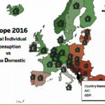 Siç është theksuar në hartë (madhësia e ikonës) dhe tendenca (zbritëse) të kolonave në lidhje me kombe të veçanta në dy harta, sa i përket renditjes Evropiane të prodhimit të brendshëm për frymë, në vend të parë është Luksemburgu (258% e mesatares europiane) me të paktën 75 pikë përqindje diferencë me Irlandën (183) dhe Zvicër (161), të dytë dhe të tretë respektivisht. E fundit sërish Shqipëria.