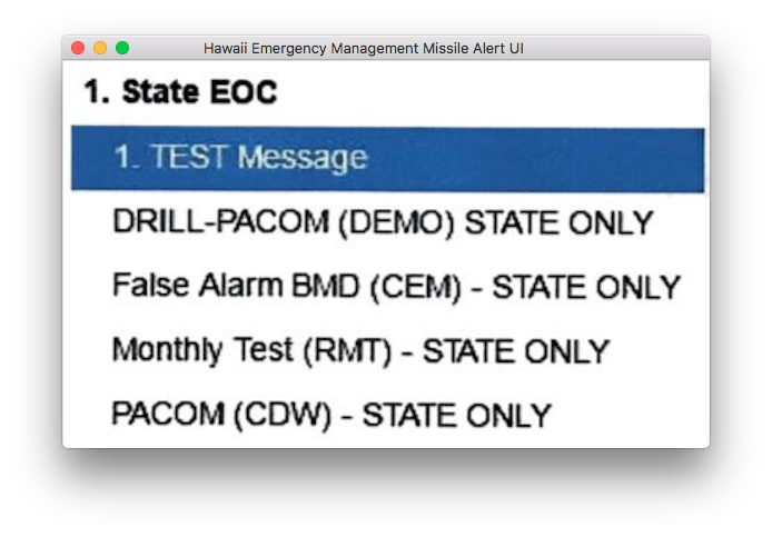 Punonjësi aksidentalisht klikoi “PACOM (CDW) – STATE ONLY” në vend të opsionit të ngjashëm me emrin “DRILL-PACOM (DEMO) STATE ONLY”, duke krijuar panik masiv deri sa një mesazh pasues 40 minuta më vonë zbuloi se ishte një gabim. Pergaditi droni.al