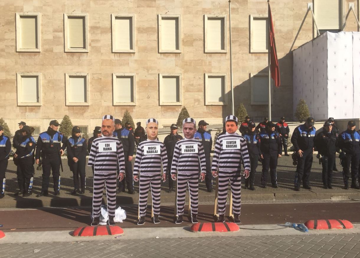 Në përfundim të saj, ndërsa protestuesit u shpërndanë, para godinës së Kryeministrisë mbetën “nën kujdesin” e Policisë, dordolecë-manekinët me fytyrat e Edi Ramës, Saimir Tahirit, Elvis Rroshit, Mark Frrokut dhe Moisi Habilaj.
