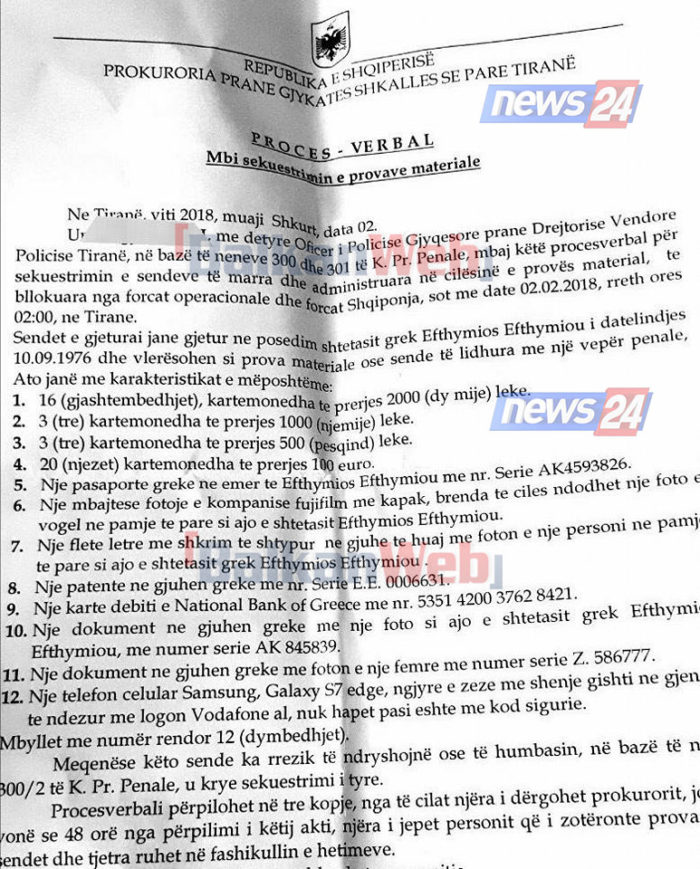Pak ditë pas arrestimit të shtetasit grek Efthymiou Efthymious, i akuzuar për vrasjen e Devi Kasmit në Tiranë, Neës24 publikoi dokumentin e Prokurorisë mbi sekuestrimin e provave materiale që i janë gjetur 41-vjeçarit.