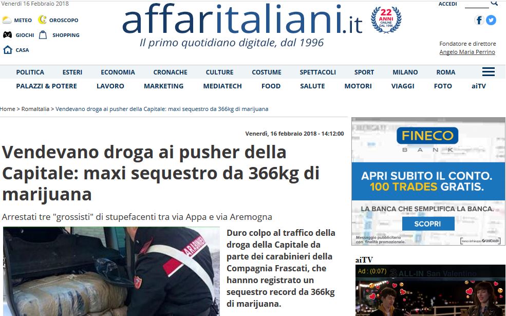 Dy shqiptarë dhe 1 italian janë vënë në pranga në komunën Fraskati në Romë pas një operacioni nga i cili u sekuestruan 366 kg marijuanë.