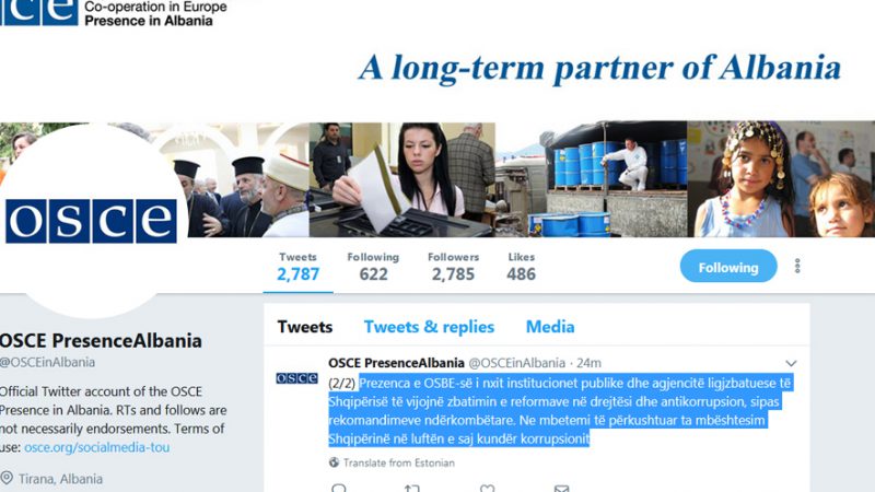 “Prezenca e OSBE-së i nxit institucionet publike dhe agjencitë ligjzbatuese të Shqipërisë të vijojnë zbatimin e reformave në drejtësi dhe antikorrupsion, sipas rekomandimeve ndërkombëtare. Ne mbetemi të përkushtuar ta mbështesim Shqipërinë në luftën e saj kundër korrupsionit”.