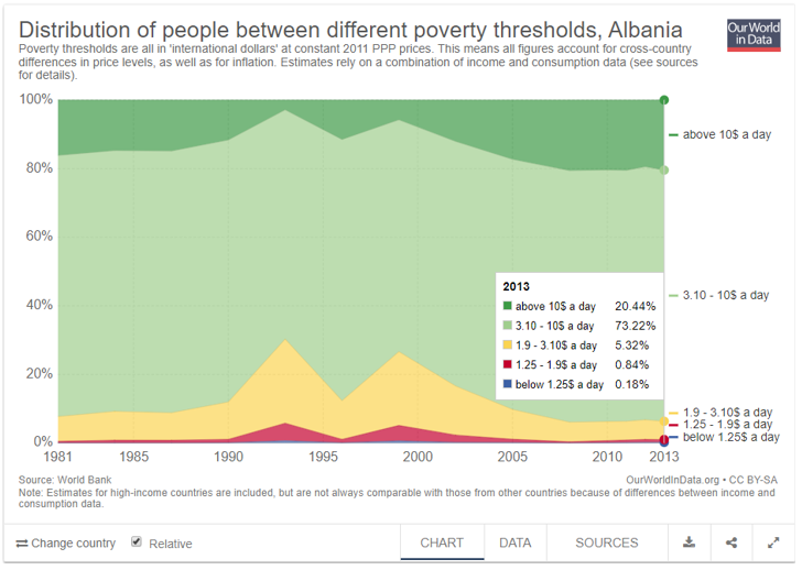 Rreth 80 për qind e popullsisë së Shqipërisë jeton me më pak se 10 dollarë në ditë. Sipas portalit Our World in Data, i cili ka përpunuar të dhënat e Bankës Botërore, për shpërndarjen e popullsisë sipas pragjeve të ndryshme të varfërisë, vetëm 20.44 për qind e popullsisë jetonin me mbi 10 dollarë në ditë, pjesa tjetër, 79.56 për qind jetonte me më pak se 10 dollarë në ditë. Të dhënat e Bankës Botërore, të vlefshme për të gjitha shtetet e botës, janë për vitin 2013.