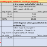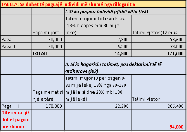 Konkretisht, marrim një të punësuar që merr dy paga bruto, një 80 mijë lekë dhe një tjetër 90 mijë lekësh, pra në total 170 mijë lekë në muaj. Në total të dyja pagat arrijnë në 2.04 milionë lekë dhe individi e përmbush kushtin për të deklaruar të ardhurat vjetore. Përgjatë vitit, individi ka paguar tatim mbi të ardhurat për secilën pagë, ku bazuar në ligjin për tatimin mbi të ardhurat, për shumën nga 0-30 mijë lekë është zero dhe për pjesën tjetër (përkatësisht 50 mijë lekë dhe 60 mijë lekë) është 13%. Ky tatim mbahet në burim nga punëdhënësi. Në total, individi ka paguar 171,600 lekë tatim mbi të ardhurat gjatë gjithë vitit (shiko pikën I në tabelë).