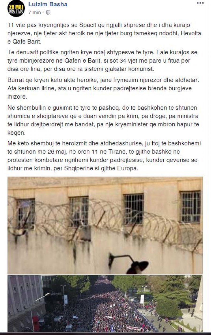 Me këto shembuj të heroizmit dhe atdhedashurisë, ju ftoj të bashkohemi të shtunën me 26 maj, në orën 11 në Tiranë, të gjithë bashkë në protestën kombëtare ngrihemi kundër padrejtësisë, kundër qeverisë së lidhur me krimin, për Shqipërinë si gjithë Europa.