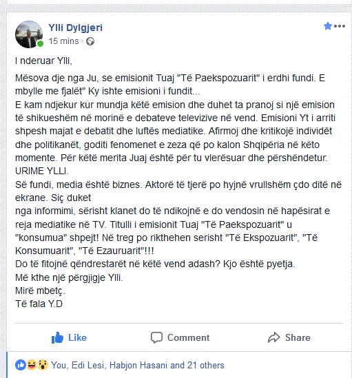 Klanet sërisht klanet do të ndikojnë e do vendosin në hapësirat e reja mediatike në TV. Tani do të rikthen “Të Ekspozuarit”, “Të Konsumuarit”, “Të Ezauruarit”!!!” Kështu shkruan në një postim në FB i mirënjohuri Ylli Dylgjeri menjehrë sapo ka marrë vesh mbylljen e emisionit “”Të Paekspozuarit” të gazetarit të miërnjohur Ylli Rakipi. Me poshtë postimi i plotë: