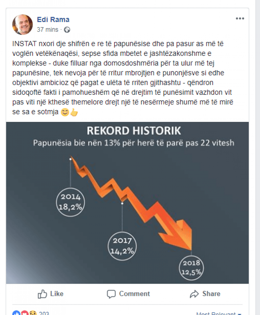 “INSTAT nxori dje shifrën e re të papunësise dhe pa pasur as më të voglën vetëkënaqësi, sepse sfida mbetet e jashtëzakonshme e komplekse – duke filluar nga domosdoshmëria për ta ulur më tej papunësine, tek nevoja për të rritur mbrojtjen e punonjësve si edhe objektivi ambicioz që pagat e ulëta të rriten gjithashtu – qëndron sidoqoftë fakti i pamohueshëm që në drejtim të punësimit vazhdon vit pas viti një kthesë themelore drejt një të nesërmeje shumë më të mirë se sa e sotmja” mburret sot në faqen e tij në Facebook Edi Rama.