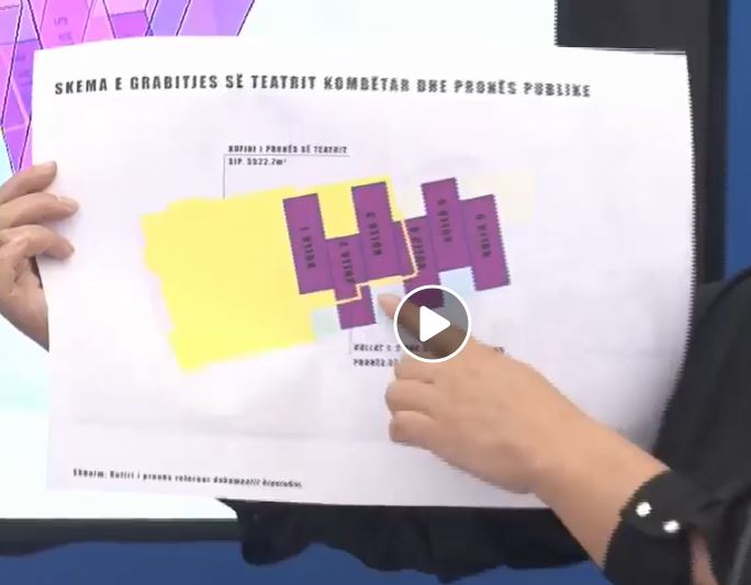 Harta tregon sipërfaqen e teatrit kombëtar sipas vërtetimit hipotekor. Pjesa me të verdhe dhe e kufizuar me të verdhë është pronë e teatrit kombëtar. 5522 m2 janë pronë e teatrit kombëtar për të cilën tha veliaj se nuk do të preken.