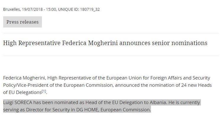 Njoftimin e ka bërë të ditur vetë zyra e shtypit të Bashkimit Europian në një njoftim për shtyp.Luigi Soreca mban postin e drejtorit të Sigurisë në DG HOME, në Komisionin Evropian.
