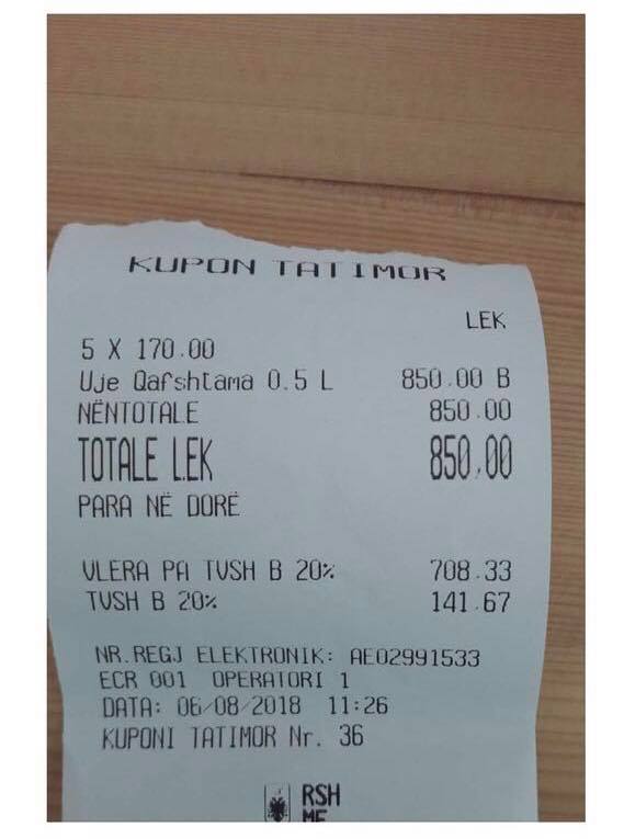 Lexoni mesazhin dhe shikon faturen ku 0,5 l ujë shitet 850 leke! sb