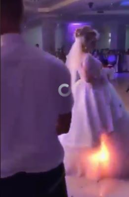 Teksa hyjnë në lokal për të përshëndetur dasmorët, ndodh një incident i papritur. Nuses i merr flakë fustani dhe kjo shkakton ‘panik’ tek dasmorët të cilët sapo e shohin që fustani po fillon të digjet, nisen për ta ndihmuar.