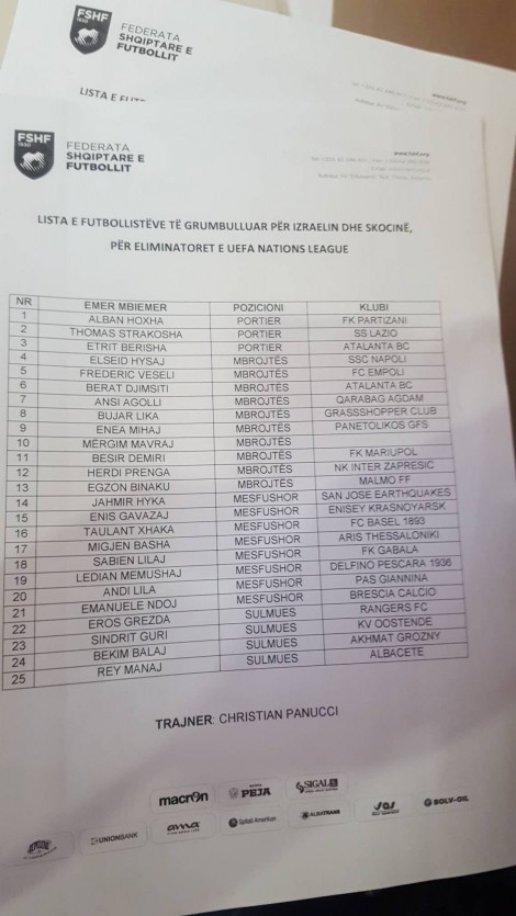 Në prag të dy ndeshjeve Kombëtares shqiptare të futbollit, trajneri Kristian Panucci ka shpallur listën e lojtarëve.