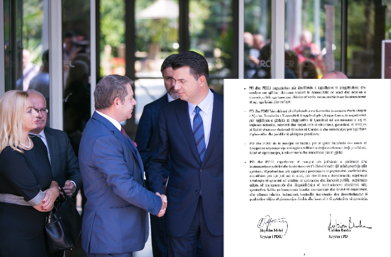 Në marrëveshjen prej 6 pikash të firmosur mes dy kryetarëve të partive, Lulzim Basha dhe Shpëtim Idrizi, mbizotëron vullneti për të larguar qeverinë qe bashkëpunon me krimin, për të krijuar kushtet për zgjedhje të lira e të ndershme dhe më pas për qeverisje në interes të qytetarëve.