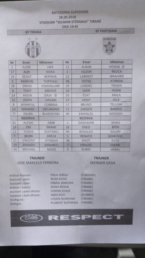 Ndërkohë janë bërë publike edhe formacionet zyrtare me të cilët skuadrat do të zbresin në fushën e lojës. Nuk mungojnë surprizat, teksa Oduamadi ja ka dalë të hedhë pas krahëve dëmtimin duke qenë në formacionin titullar. Për sa i përket Partizanit, nuk ka surpriza, ku Bardhi do të jetë në majë të sulmit, i ndihmuar nga Mensah.