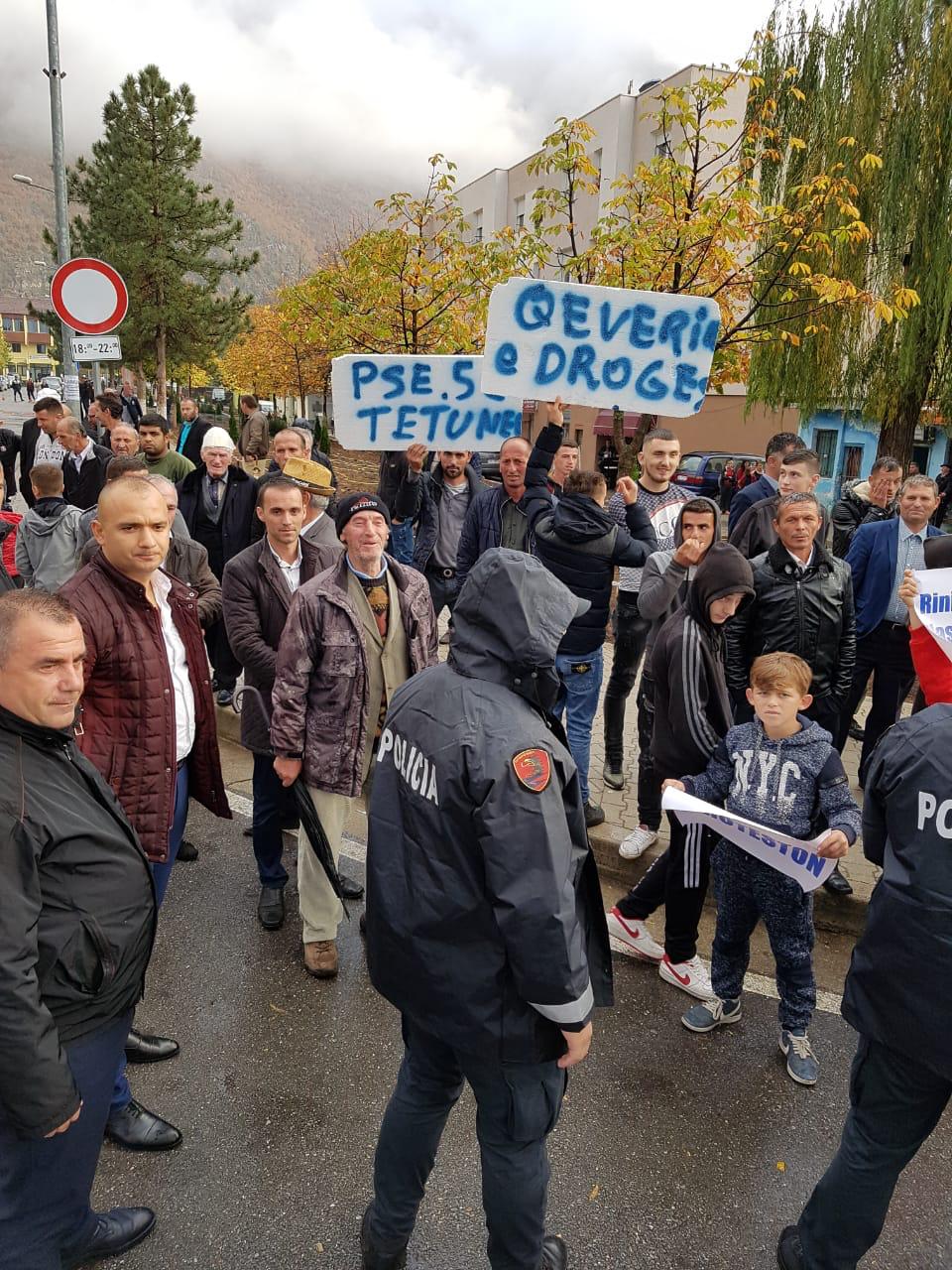 “Qeveri e drogës”, “Jo taksës së rrugës së Kombit”, “Rinia e Hasit nuk të do” ishin disa prej pankartave të protestës nga të rinjtë e FRPD dhe banorët kundër Edi Ramës.