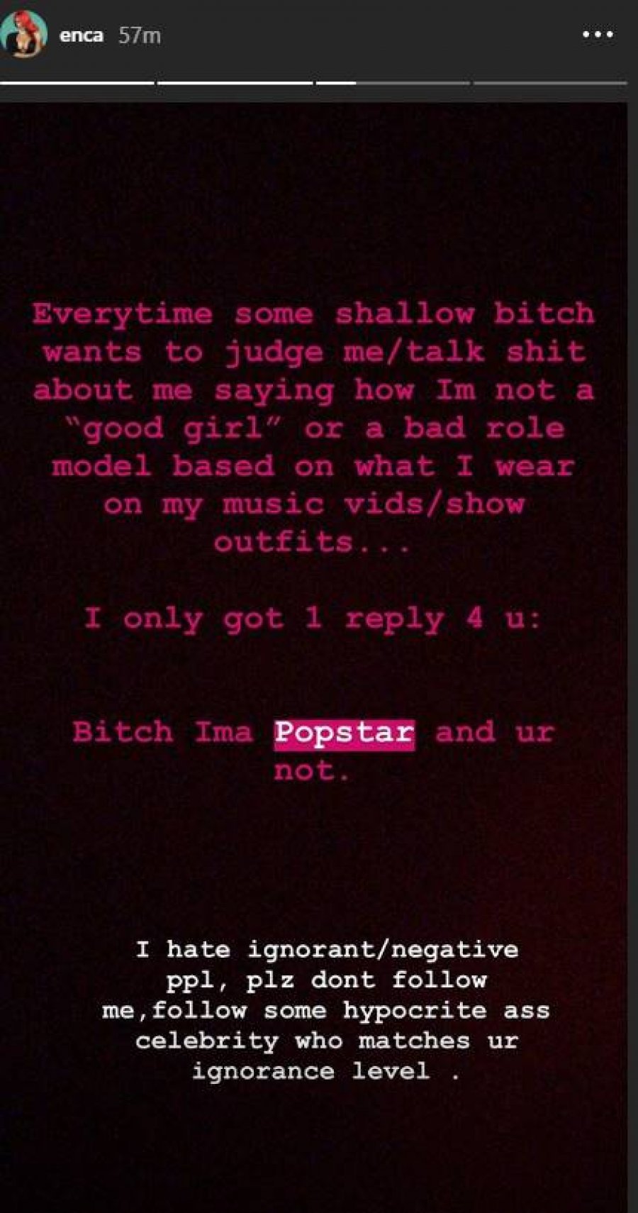 K*rvë unë jam një yll popi dhe ti nuk je.I urrej njerëzit hipokritë, ju lutem mos më ndiqni” shkruan ajo krahas fotos.