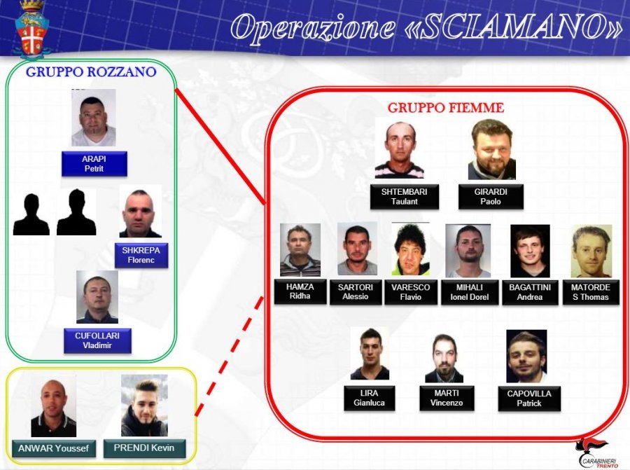 Grupi ishte i lidhur direkt me një ekip të trafikantëve të drogës së “nivelit të lartë” i vendosur në Milano dhe i kryesuar nga shqiptari Petrit Arapi, shpërndarës droge me një histori qëndrimi në Val di Fiemme që e lejuan atë në kohë të vështira për të vendosur marrëdhënie me Shtëmbarin