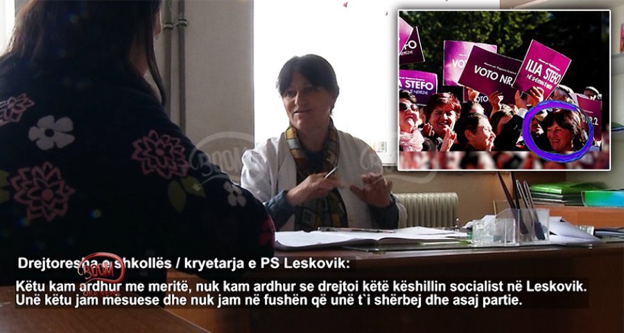 Drejtoresha e shkollës/kryetarja e PS Leskovik: Moj në shkollë ne bëjmë qytetari, bëjmë filozofi, bëj unë ç`janë partitë politike, ç`janë sistemet e zgjedhjeve, pra unë në shkollë mbuloj këto lëndë; qytetari, mbuloj ekonominë, mbuloj filozofinë dhe nuk bëj politikë, voto për këtë dhe voto për atë.