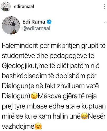 Ditën e djeshme, kryeministri Edi Rama zhvilloi një takim me studentë të Gjeologjikut, ku sipas tij ishte një takim shumë frytdhënës, pasi mësoi shumë prej studentëve.
