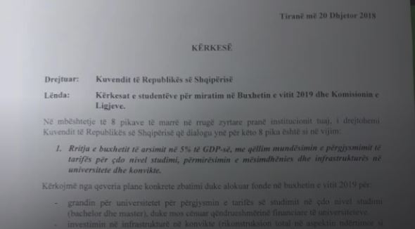 Studentët protestues i kanë drejtuar Kuvendit të Shqipërisë disa kërkesa që duan të plotësohen me buxhetin e vitit 2019, të cilat kanë në bazë 8 pikat e parashtruara prej tyre që në fillimet e protestës. Si pikë të parë në këtë letër drejtuar Kuvendit, studentët rendisin kërkesën për rritjen e buxhetit të arsimit në 5% të GDP-së, me qëllim përgjysmimin e tarifës për çdo nivel studimi. Po ashtu studentët kërkojnë përmirësimin e mësimdhënies dhe infrastrukturës në universitete dhe konvikte si edhe transparencë me buxhetin nga Ministria e Arsimit, Institucionet e Arsimit të Lartë dhe publikim të shpenzimeve online.