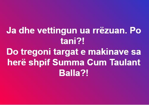 ’Ja edhe vetingun ua rrëzuan. Po tani?! Do tregoni targat e makinave sa herë shpif Summa Cum Taulant Balla?!”