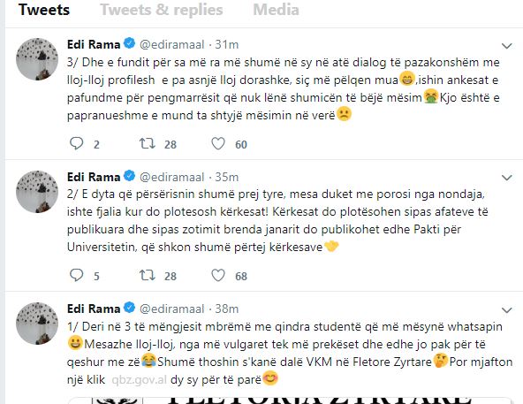 “Deri në 3 të mëngjesit mbrëmë me qindra studentë që më mësynë whatsapinMesazhe lloj-lloj, nga më vulgaret tek më prekëset dhe edhe jo pak për të qeshur me zëShumë thoshin s’kanë dalë VKM në Fletore ZyrtarePor mjafton një klik http://qbz.gov.al dy sy për të parë. E dyta që përsërisnin shumë prej tyre, mesa duket me porosi nga nondaja, ishte fjalia kur do plotesosh kërkesat! Kërkesat do plotësohen sipas afateve të publikuara dhe sipas zotimit brenda janarit do publikohet edhe Pakti për Universitetin, që shkon shumë përtej kërkesave. Dhe e fundit për sa më ra më shumë në sy në atë dialog të pazakonshëm me lloj-lloj profilesh e pa asnjë lloj dorashke, siç më pëlqen mua,ishin ankesat e pafundme për pengmarrësit që nuk lënë shumicën të bëjë mësimKjo është e papranueshme e mund ta shtyjë mësimin në verë☹️”, shkruan Rama.
