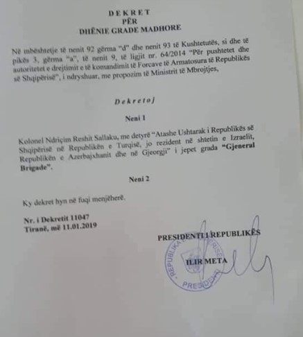 “Kolonel Ndriçim Rreshit Sollaku me detyrë “Atashe Ushtarak i Republikës së Shqipërisë në Republikën e Turqissë”, jo rezident në shtetin e Izraelit, Republikën e Azerbajxhanit dhe në Gjeorgji” i jepet grada “Gjeneral Brigade” thuhet në dekretin e Metës.
