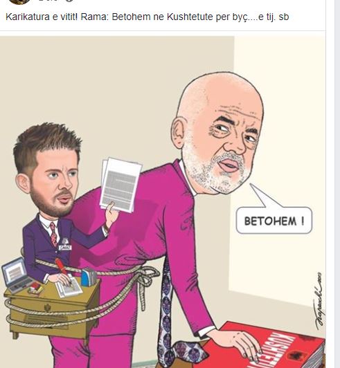 Përmes ironisë ish-kryeministri shpjegon edhe kuptimin e karikaturës. Sipas tij Rama është betuar si Ministër i Jashtëm me këto fjalë “Betohem ne Kushtetute per byç….e tij (Gent Cakajt) . sb”.