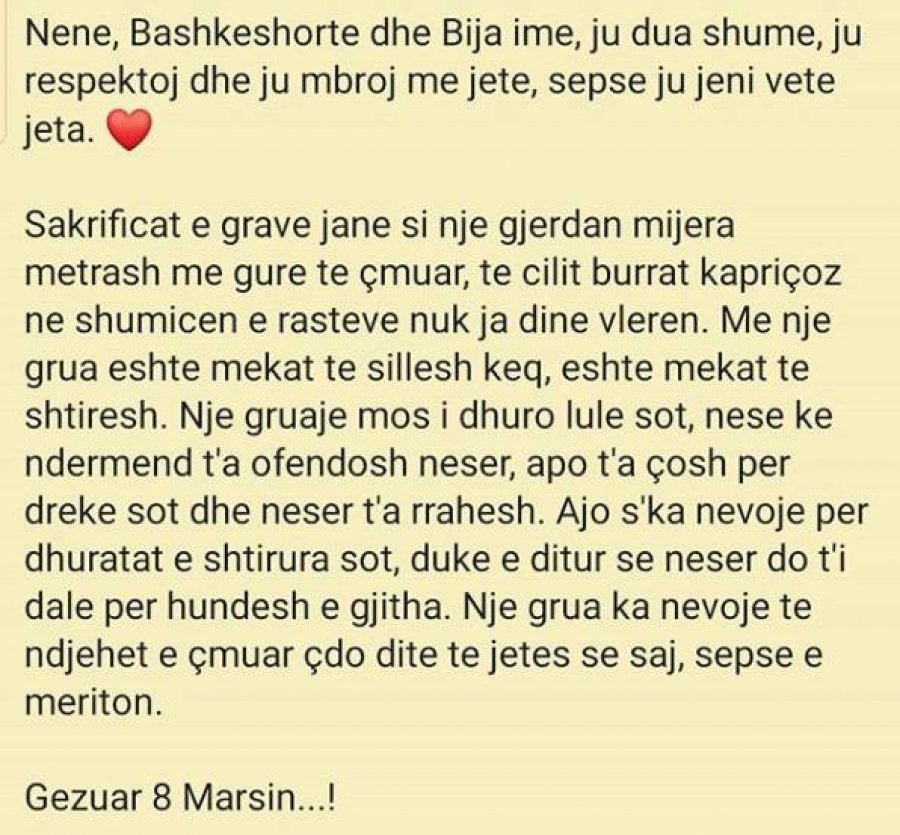 Deda iu rikujton të gjithëve se një grua duhet të jetë e lirë, e sigurt dhe e vlerësuar në çdo ditë të saj, jo vetëm për 8-Mars.
