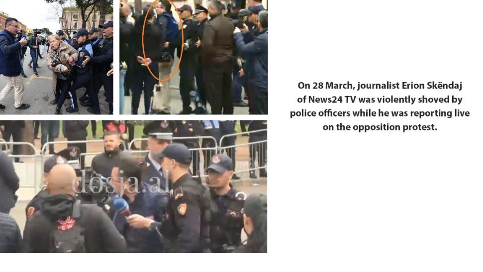 - Erion Skëndaj, gazetari i përkushtuar i Neës24, u godit dhe u largua me forcë nga policia, ndërkohë që po raportonte live protësten e opozitës më 28 mars.