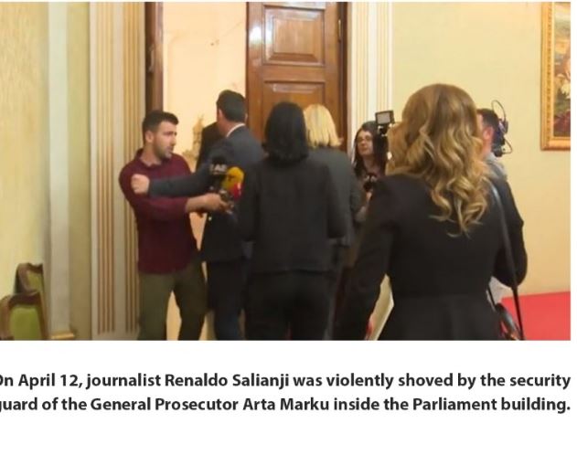 - Gazetari Renaldo Salianji u shty me forcë nga truproja e Prokurores së Përkohshme Arta Marku, në kohën kur ai ishte në detyrë në pasqyrimin e një aktiviteti në Kryesinë e Kuvendit.