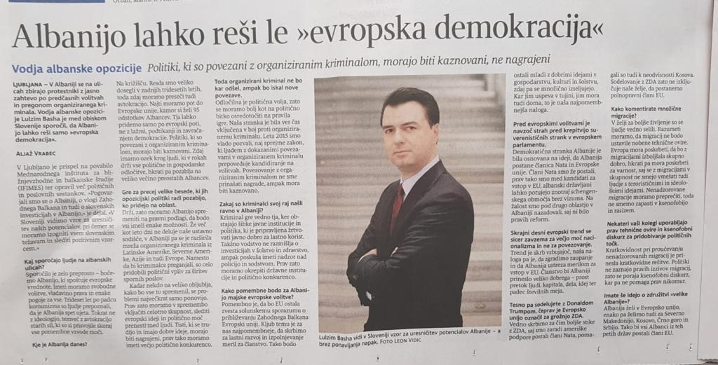 Kreu i Partisë Demokratike Lulzim Basha ka dhënë së fundmi një intervistë për gazetën sllovene Delo. Kjo është një nga gazetat më të medha në Slloveni, që e intervistoi Bashën pas vizitës së tij ne Ljubjane.
