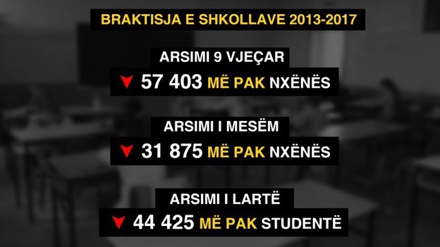 Ndërkohë rënia në pikiatë e financimit për arsimin e lartë dhe arsimin në tërësi shoqërohet vetëm nga një rënie tjetër në pikiatë, e cila është me të vërtetë e tmerrshme, braktisja e studimeve. 133 mijë nxënës dhe student kanë braktisur në këto 4 vite shkollën, pra 1 në 6 nxënës dhe 1 në 4 studentë, po të marrim statistikat zyrtare të vendit. Në vitin 2013-2014, numri total i nxënësve të regjistruar ishte 786 mijë. Në vitin 2017-2018, ky numër ky numër briti në 653 mijë. Në këto 4 vite, 2013-2-17, sipas statistikave, arsimi 9-vjeçar ra me 57403 nxënës më pak. Në arsimin e mesëm u regjistruan 31 875 nxënës më pak dhe në arsimin e lartë 44 425 më pak student.