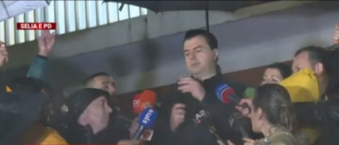 ‘Forca e popullit të bashkuar, juve s’ka cfarë të ju bëjë po mikrofonin e prishi shiu. Mikrofoni nuk është aq i fortë sa protestuesit por forca prej hekuri është po jo aq i fortë sa ju. Forca jonë është bashkimi pjesëmarrja vendosmëria e nuk i bën dot ballë as Rama as banda e tij e inkriminuar’, tha kryedemokrati, teksa mundohej ta rregullonte foninë e mikorofonit, i cili u lag nga shiu.