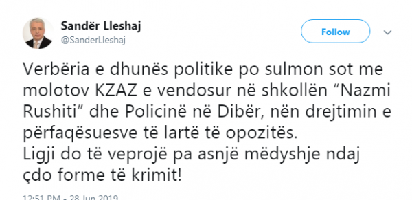 Lleshaj shkruan në “Twitter” se verbëria e dhunës politike po sulmon sot me molotov KZAz e vendosur në shkollën “Nazmi Rushiti” dhe policinë në Dibër.