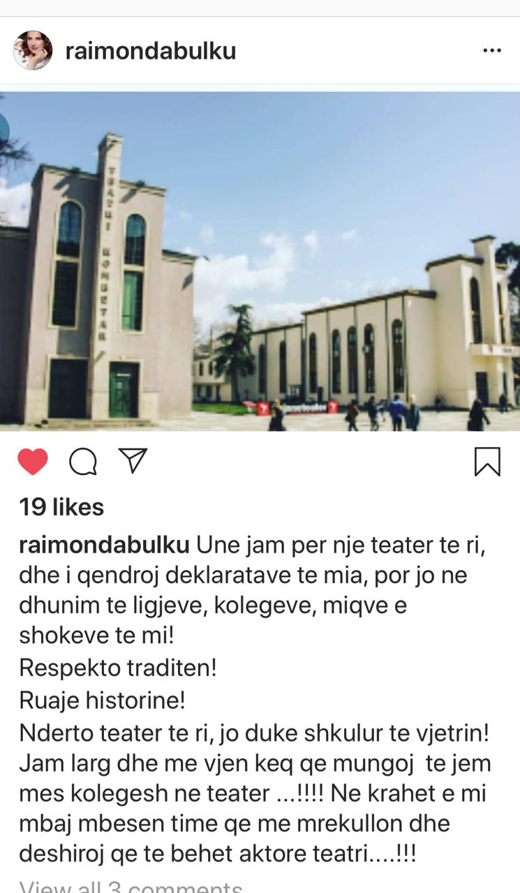 Nderto teater te ri, jo duke shkulur te vjetrin! Jam larg dhe me vjen keq qe mungoj te jem mes kolegesh ne teater …!!!! Ne krahet e mi mbaj mbesen time qe me mrekullon dhe deshiroj qe te behet aktore teatri….!!!”,-shkruan aktorja.