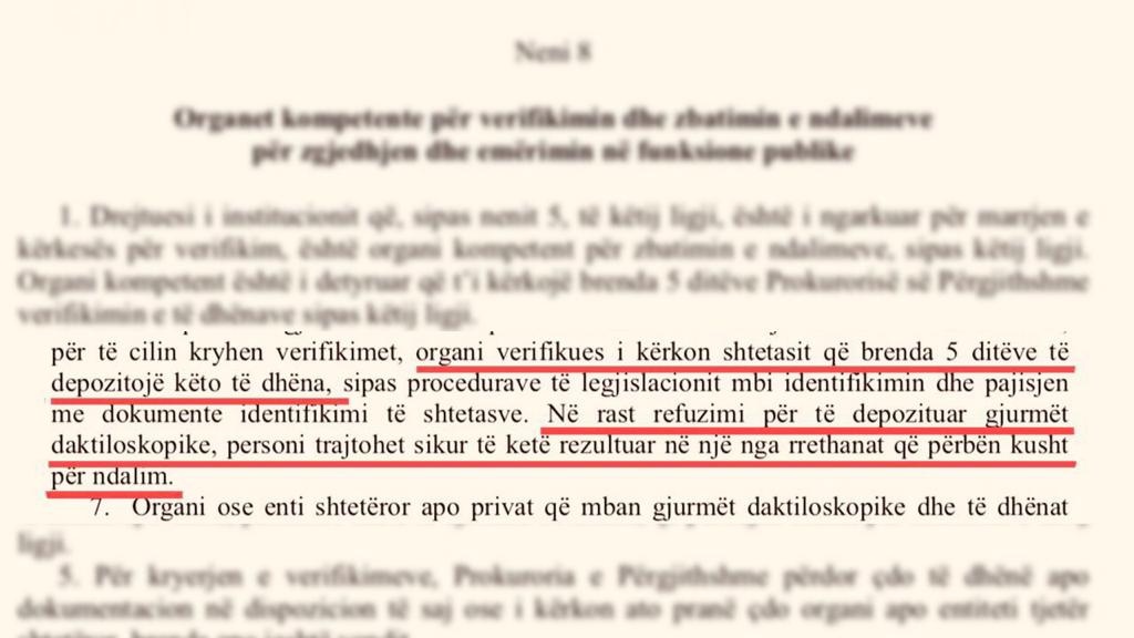 Sipas ligjit të dekriminalizimit, personi që nuk jep shenjat e gishtërinjve 5 ditë nga marrja e njoftimit, humbet menjeherë mandatin dhe shkarkohet nga funksioni shtetëror.