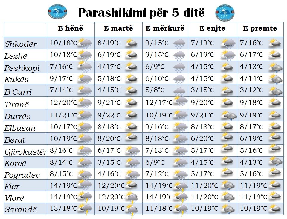 Më tej, deri të martën në mbrëmje, do të vijojë situatë e qendrueshme. Reshjet do të rikthehen kryesisht të mërkurën, në formën e rrebesheve, më tepër në jug e lokalisht në zonat e ulëta me shkarkesa elektrike.