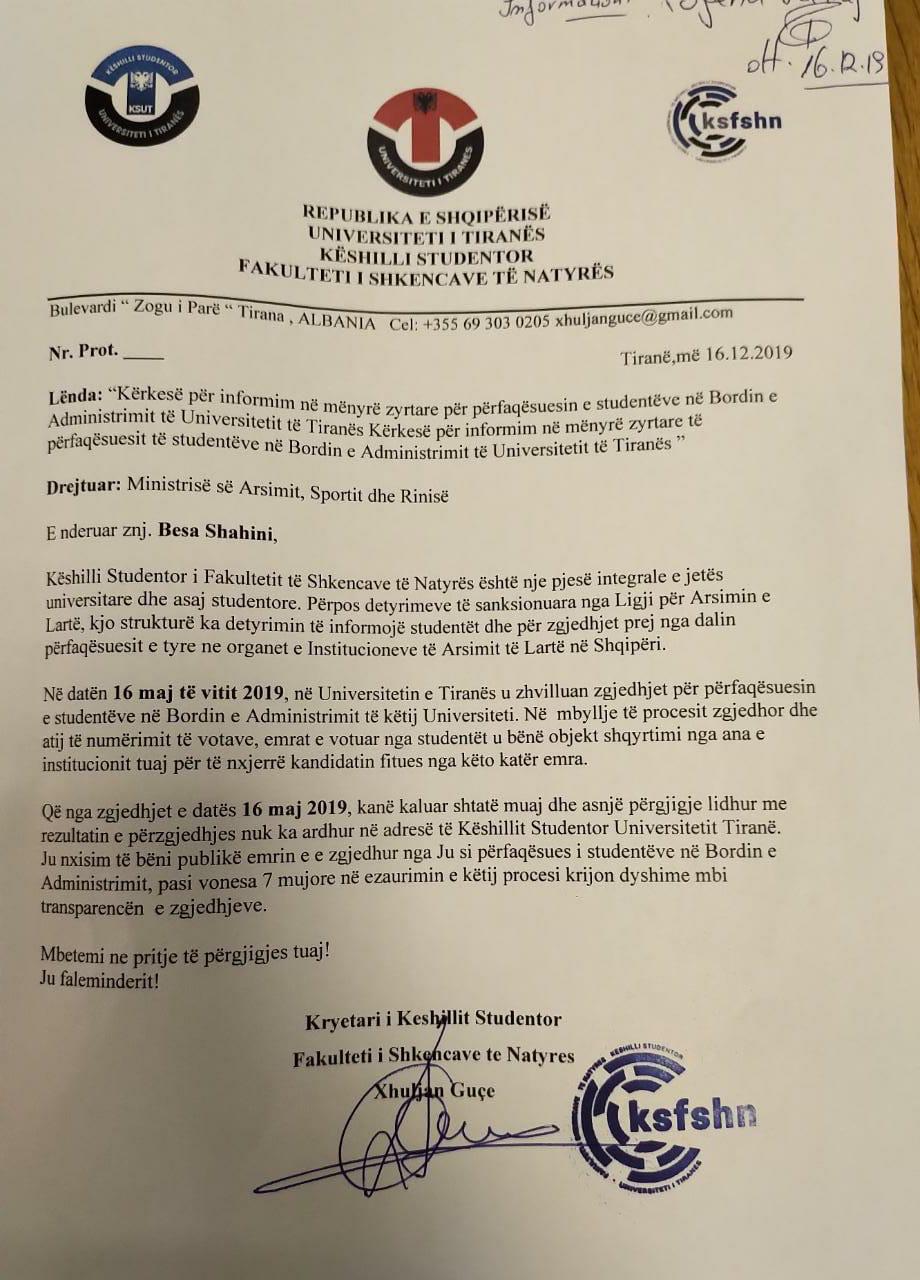 Këshilli Studentor i Fakultetit të Shkencave të Natyrës  ka bërë një kërkesë zyrtare ministrisë së Arsimit në lidhje me procesin e zgjedhjeve të përfaqësuesit studentor në Bordin e Administrimit të Universitetit të Tiranës.