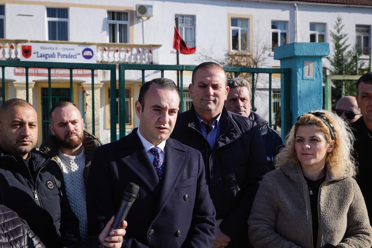 Jemi në shkollën “Lasgush Poradeci “në Kombinat me përfaqësuesit e Partisë Denmokratike Dega 6, për të denoncuar vjedhjen makabre të Bashkisë, ku paratë e qytetarëve të cilat shkojnë për infrastrukturën arsimore, janë çuar dëm, janë vjedhur, pasi në këtë shkollë nuk ëstë bërë asnjë investim dhe pasojat duken qartazi, shkolla sot, për shkak të tërmetit, është mbyllur. Për shkak të mungesës së investimeve, është mbyllur.
