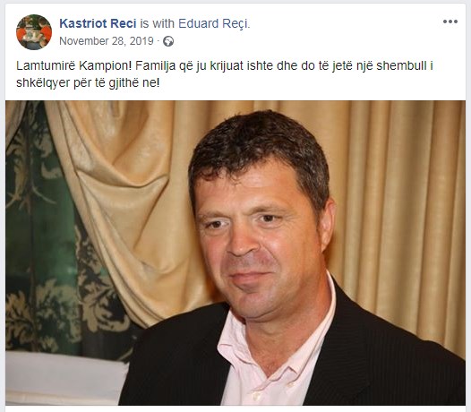 “Lamtumirë kampion! Familja që ju krijuat ishte dhe do të jetë një shembull i shkëlqyer për të gjithë ne”, shkruante Kastriot Reçi 2 ditë pas tërmetit.