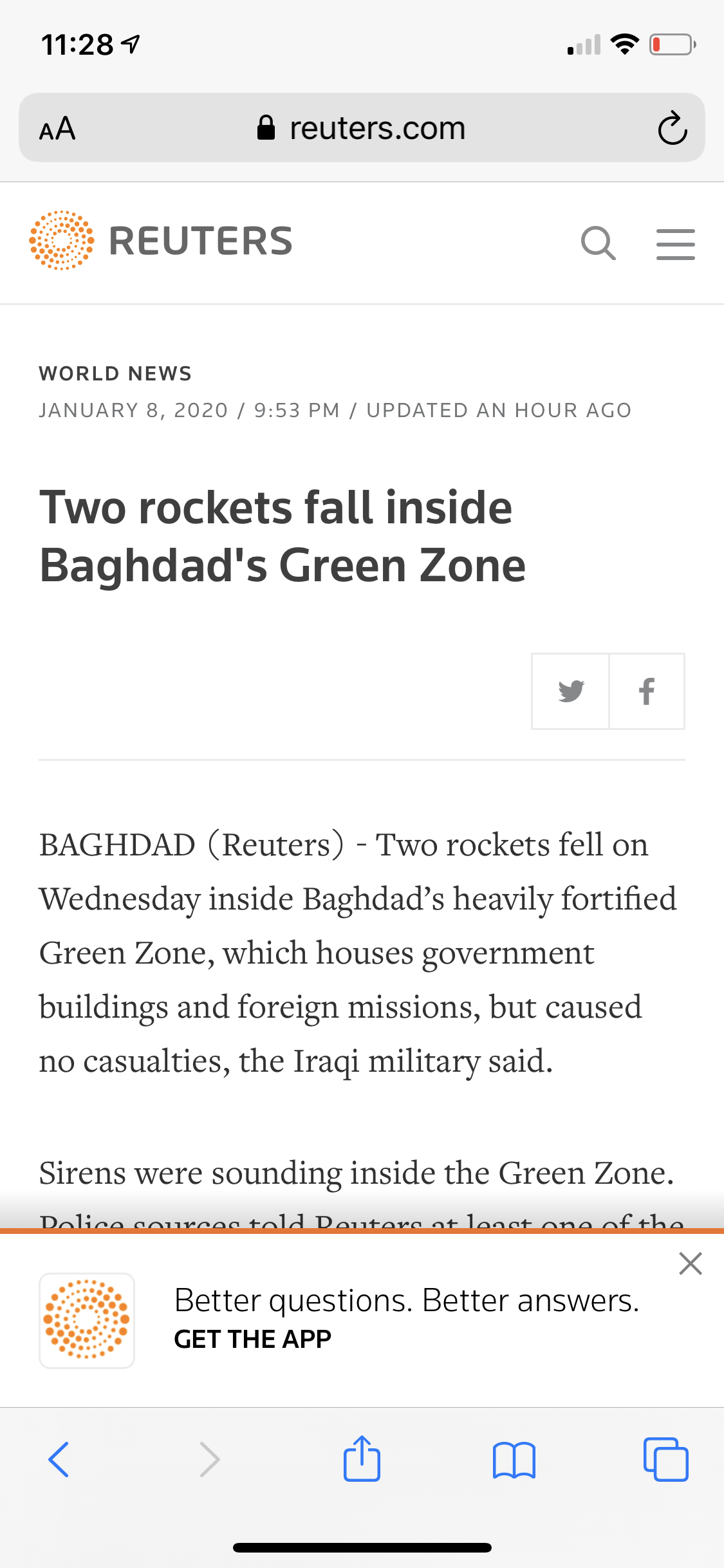 Tjetër sulm ndaj Shteteve të Bashkuara të Amërikës në Irak dhe vendeve perëndimore. Pas sulmit të një nate më parë një tjetër është ndërmarrë para pak çastesh. Mësohet se 2 raketa “Katjusha” janë hedhur në atë që njihet si “Zona e gjelbër” në Bagdad ku kanë selitë e tyre shumë ambasada mes të cilave edhe ajo e SHBA-ve.
