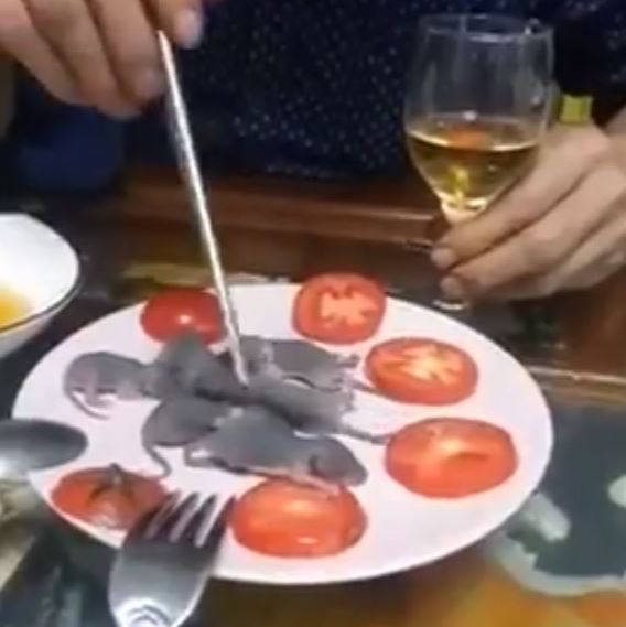 Një burrë kinez shifet teksa konsumon pjatën me minj të gjallë, ku pasi i merr nga pjata, i zhyt në një salcë për t’i mbytur dhe më pas për t’i ngrënë.