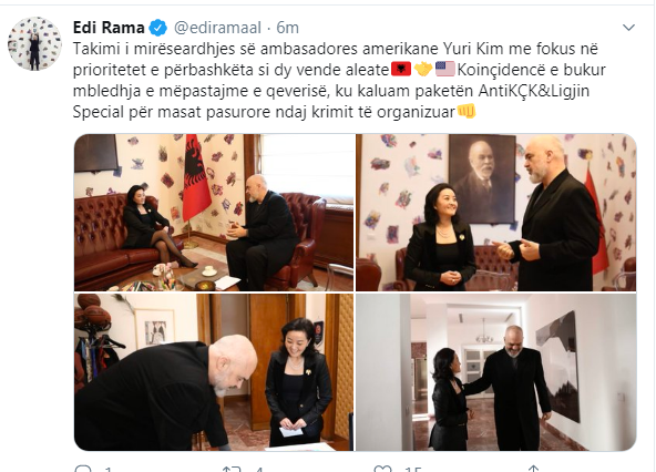 “Takimi i mirëseardhjes së ambasadores amerikane Yuri Kim me fokus në prioritetet e përbashkëta si dy vende aleate🇦🇱🤝🇺🇸Koinçidencë e bukur mbledhja e mëpastajme e qeverisë, ku kaluam paketën AntiKÇK&Ligjin Special për masat pasurore ndaj krimit të organizuar👊”, shkruan Rama.