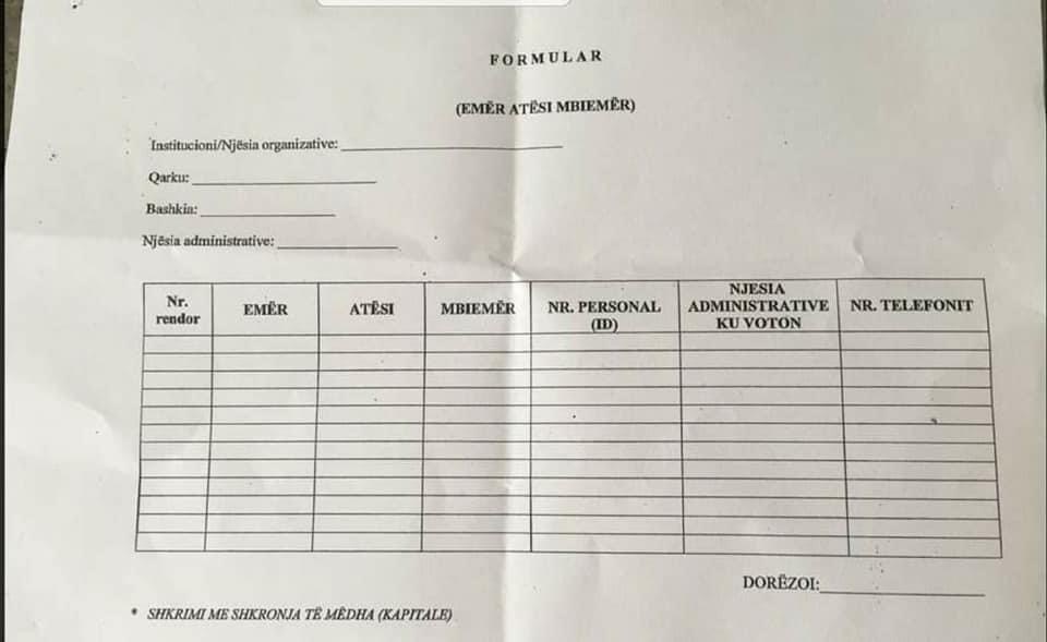 Prej disa ditesh zyrtare te ndryshem te administrates publike kane denoncuar nje rast te paprecedent, hartimin e listave me te njohur, perfshire dhe te dhena kofidenciale si telefoni dhe ID, brenda nje formulari. Ky i fundit eshte kusht per tu mbajtur ne pune nese PS do te qendroj ne pushtet.