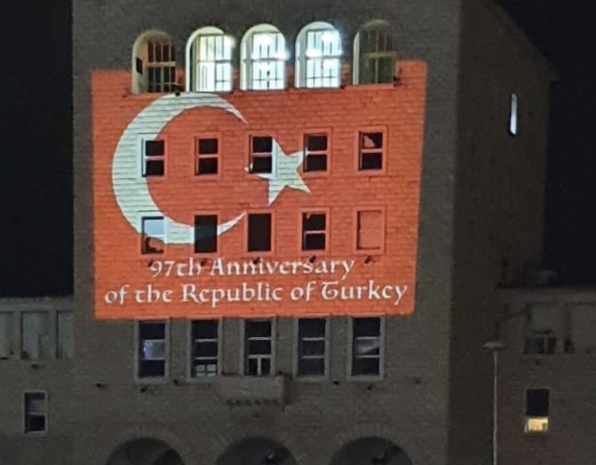 Ne nje prej shesheve me impozante te Tiranes u projektua sonte nje flamur gjigant i Turqise. Ne murin e Universitetit Politeknik të Tiranës mbrëmjen e së enjtes u shpalos flamuri turk në krah të flamurit shqiptar bashkë me urimin për 97-vjetorin e themelimit të Republikës së Turqisë.
