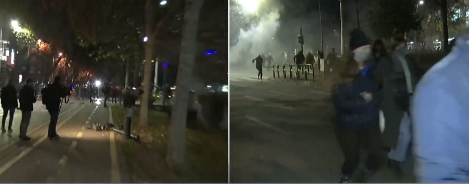 Fillimisht policia ka hedhur uje me ngjyre mbi protestuesit. Me pas jane hedhur bomba me gaz lotsjelles duke i shperndare per momentin. /DRONI.al/