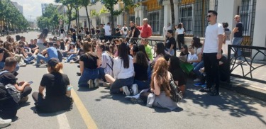 Ata protestuan para Ministrisë së Arsimit dhe Sporteve me pankarta ku shkruhet: ‘Ministre eja na zgjidh testin’, ndërsa kanë vendosur të ulen këmbëkryq para godinës.